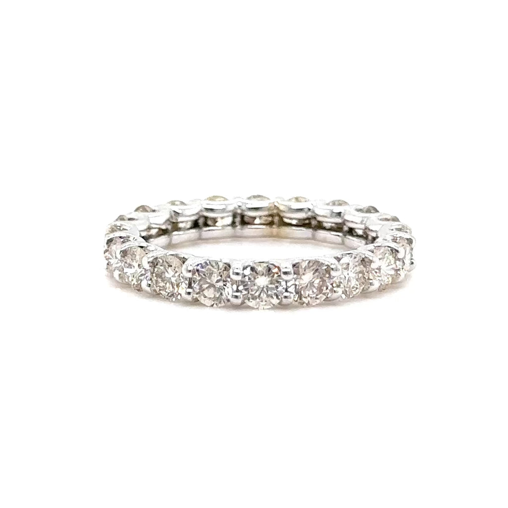 Esta alianza de eternidad se ha fabricado en oro blanco de 18 k y tiene engaste de 0,6 quilates de diamantes redondos de talla brillante. Estos 20 diamantes tienen color J, claridad SI1, muy buena talla, con fluorescencia azul calcárea moderada. Este anillo mide 3,33 mm de ancho, tiene un tamaño de 6,5 y se puede ajustar. Tenga en cuenta que el tamaño se realizaría agregando una barra de tamaño de oro blanco de 18k; aumentar el tamaño con diamantes para continuar la “eternidad” sería un cargo adicional.