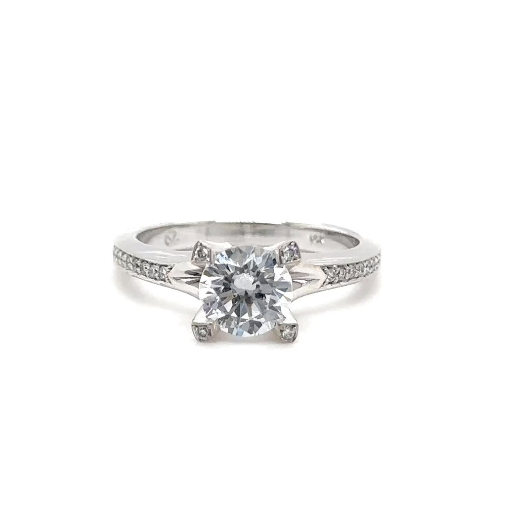 Este montaje de anillo de compromiso, estilo # PLT-3842-MP, ha sido elaborado en oro blanco de 18k con 38 diamantes engastados a lo largo de sus hombros y catedral con una circonita cúbica de 6 mm engastada entre sus cuatro puntas tachonadas de diamantes, que miden 7 mm de ancho. Este anillo mide 3,2 mm en los hombros, se estrecha a 2,2 mm en el vástago, tiene un tamaño de 6,25, se puede dimensionar y pesa 3,55 dwt.