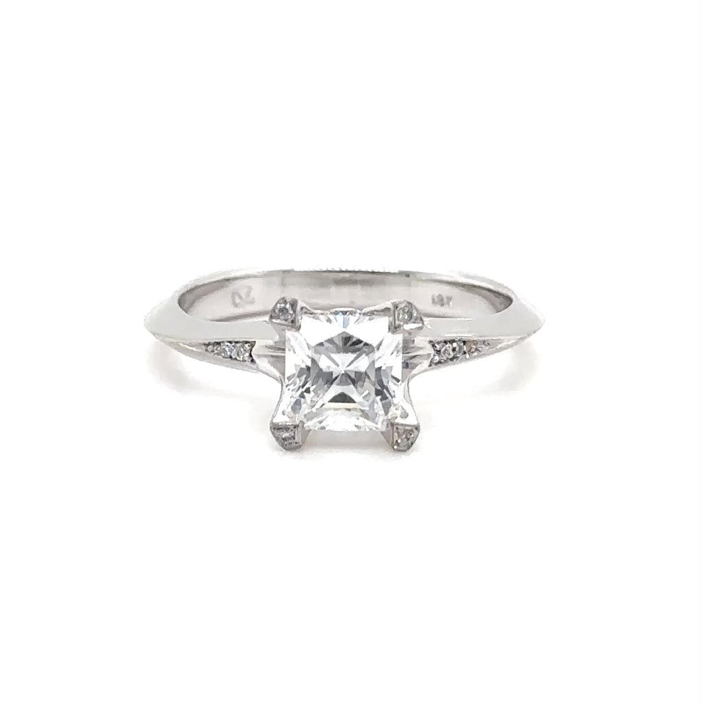 Este anillo de compromiso, estilo # PLT-3910-MP, ha sido elaborado en oro blanco de 18k con 10 diamantes engastados a lo largo de sus hombros y catedral con una circonita cúbica de talla princesa de 5,4 mm engastada entre sus cuatro puntas tachonadas de diamantes, que miden 7,3 mm de ancho. Este anillo mide 2,5 mm en los hombros, se estrecha a 2,3 mm en el vástago, tiene un tamaño de 6,5, se puede dimensionar y pesa 2,85 dwt.