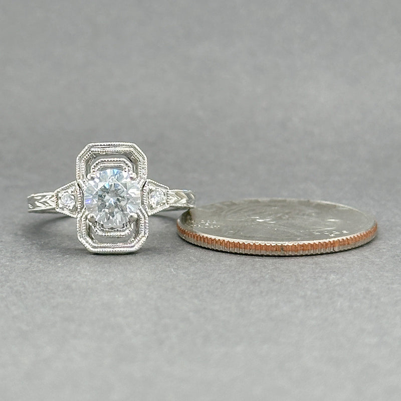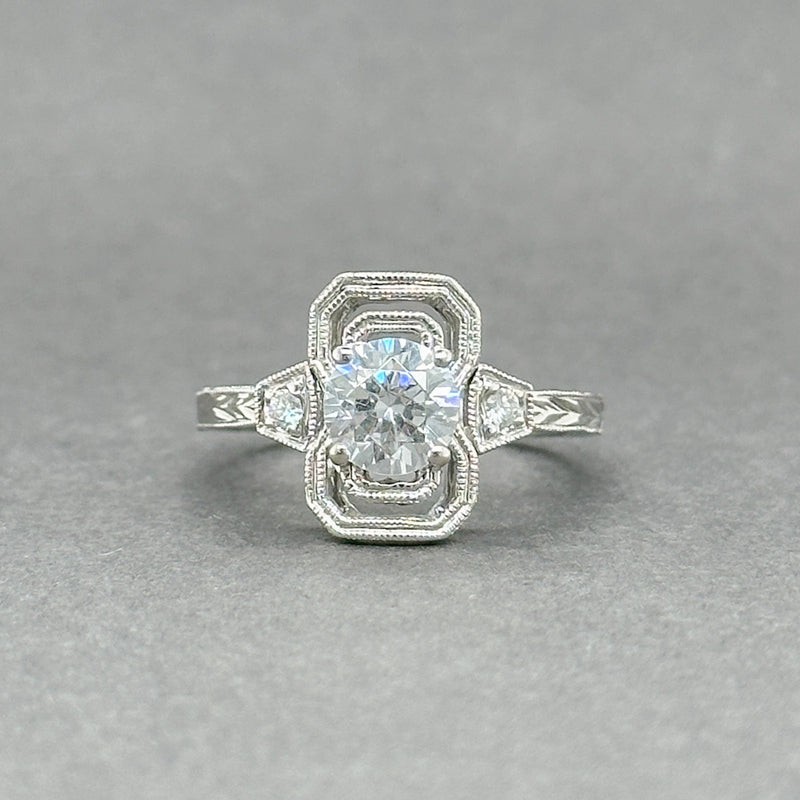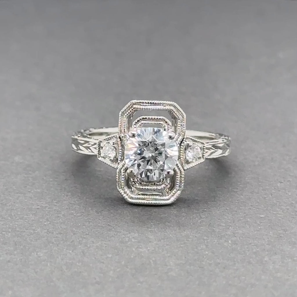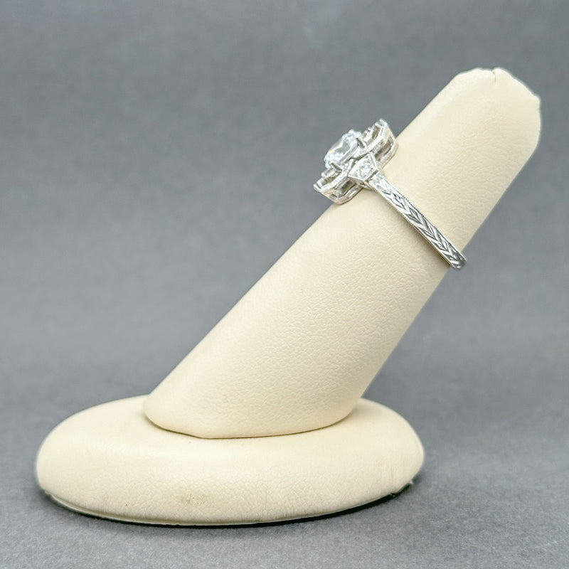 Elevate your love story with the Estate 14K Gold Diamond Engagement Ring. Crafted in luxurious 14k white gold, this ring features two stunning G color, SI1 clarity round diamonds totaling 0.05ctw. A brilliant round cubic zirconia set in the center adds a touch of sparkle. With a size 6.5 that can be adjusted and designed to fit a 6.5mm round stone or 1ct round diamond, this ring is the perfect symbol of your eternal love.