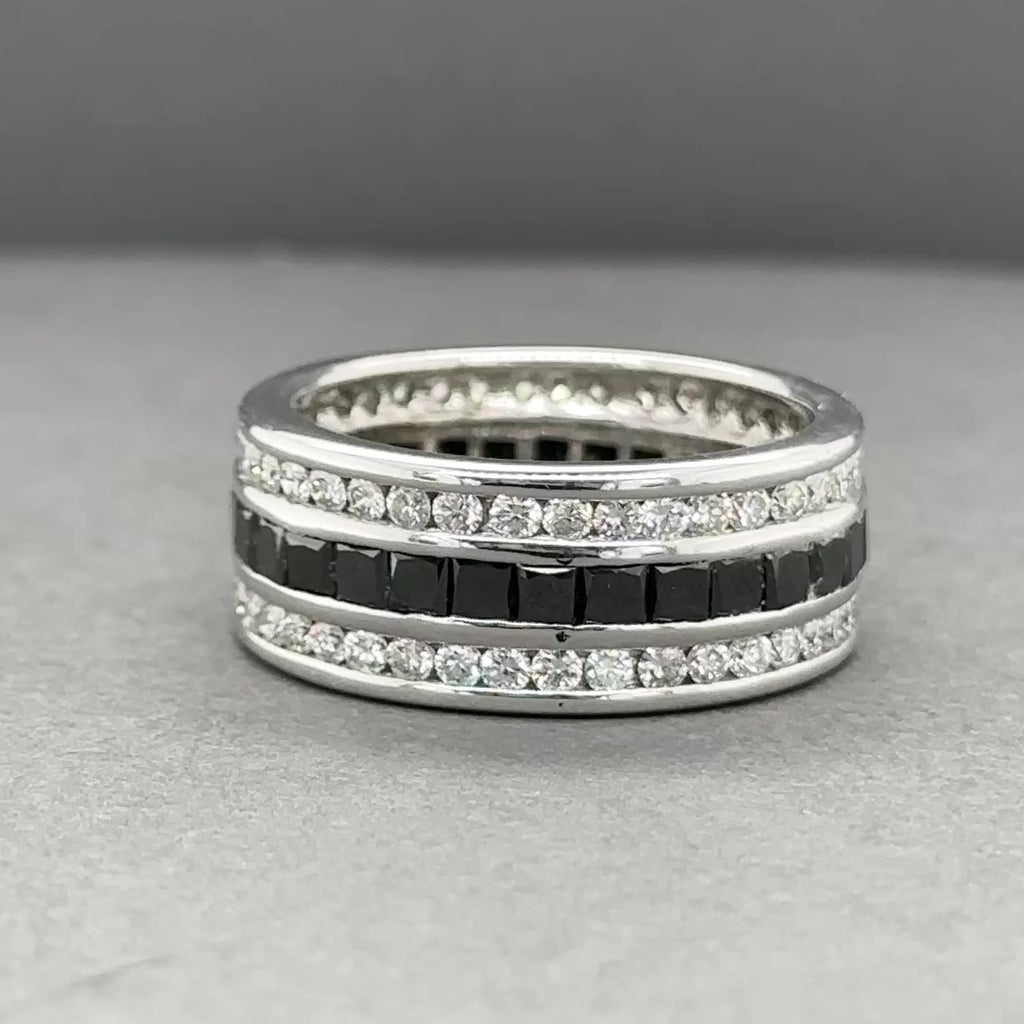 This exquisite eternity ring showcases the striking contrast of black and white diamonds set in lustrous 14K white gold. Featuring 30 princess-cut fancy black diamonds (2.87ctw) alternating with 77 round brilliant diamonds in H-I color, SI1-2 clarity (1.85ctw), each stone is expertly channel-set for a seamless, sophisticated design. Measuring 9.50mm in width, this timeless piece offers substantial presence on the finger. Crafted to perfection at size 10 and weighing 7.54dwt, this estate ring represents enduring elegance and cannot be resized.