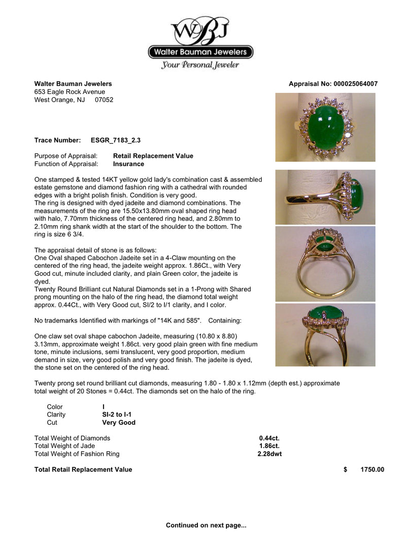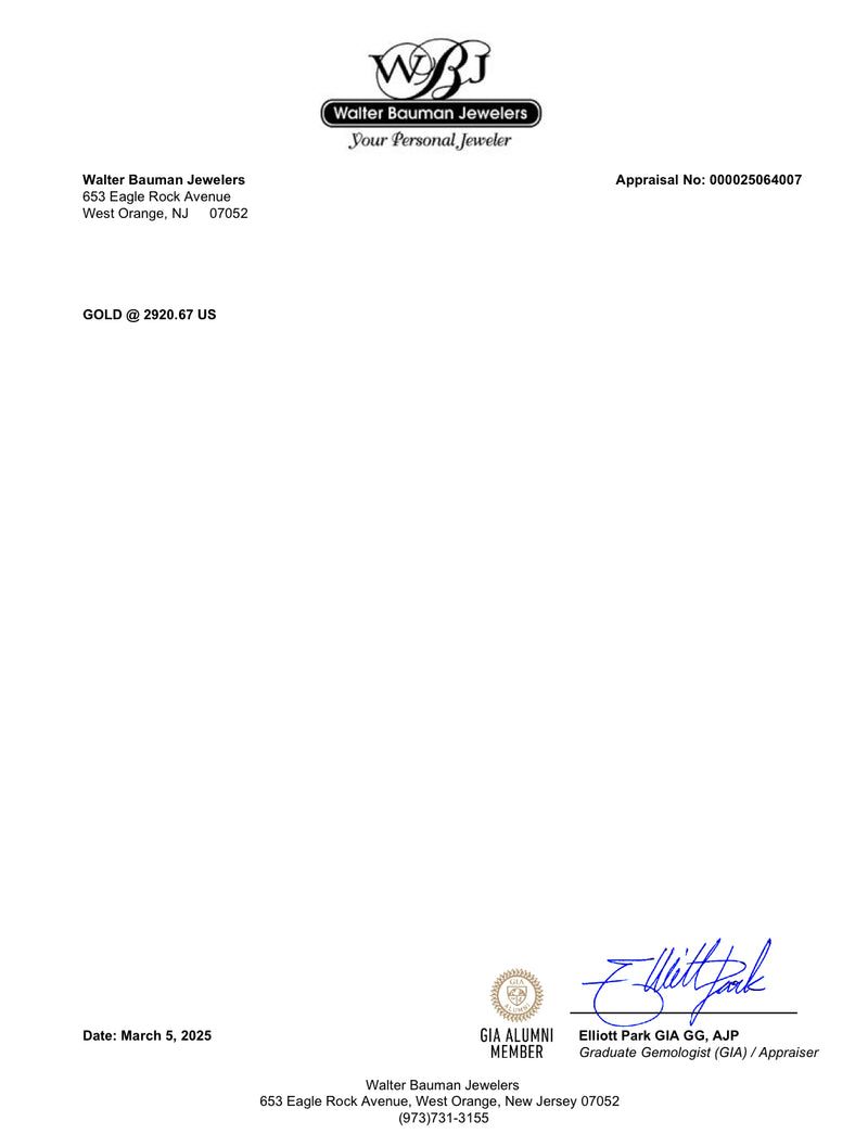 This estate piece comes with two customized copies of the Walter Bauman Jewelers appraisal, available upon request.