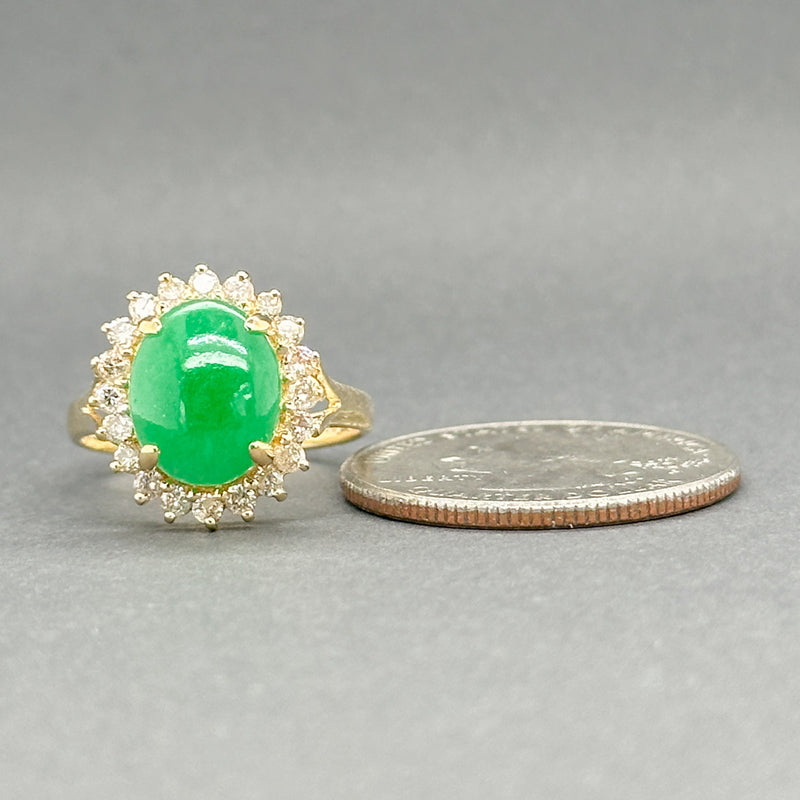 Indulge in luxury with our Estate 14K Gold Jade & Diamond Ring. Crafted with 14k yellow gold, it features a beautifully dyed oval cabochon jadeite, 20 dazzling I color and SI2-I1 clarity diamonds, and a generous size of 6.75. Its top measures 15.50mm and its band measures 2.10mm, making it a stunning statement piece. Can be sized to fit. Weighs 2.28dwt.