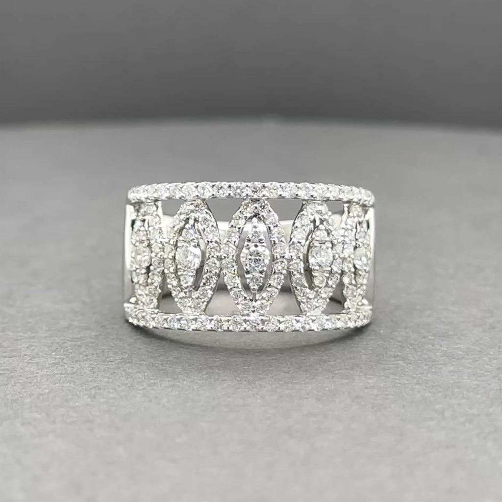 This elegant estate ring showcases 137 round brilliant diamonds totaling 0.94 carats, graced with H-I color and SI1-2 clarity stones set in lustrous 18K white gold. The sophisticated wide band measures 11.70mm across its top, creating a striking presence on the finger. Currently sized at 6.75 and weighing 5.09 dwt, this timeless piece can be professionally resized to fit your needs. A refined addition to any jewelry collection, blending classic design with enduring sparkle.