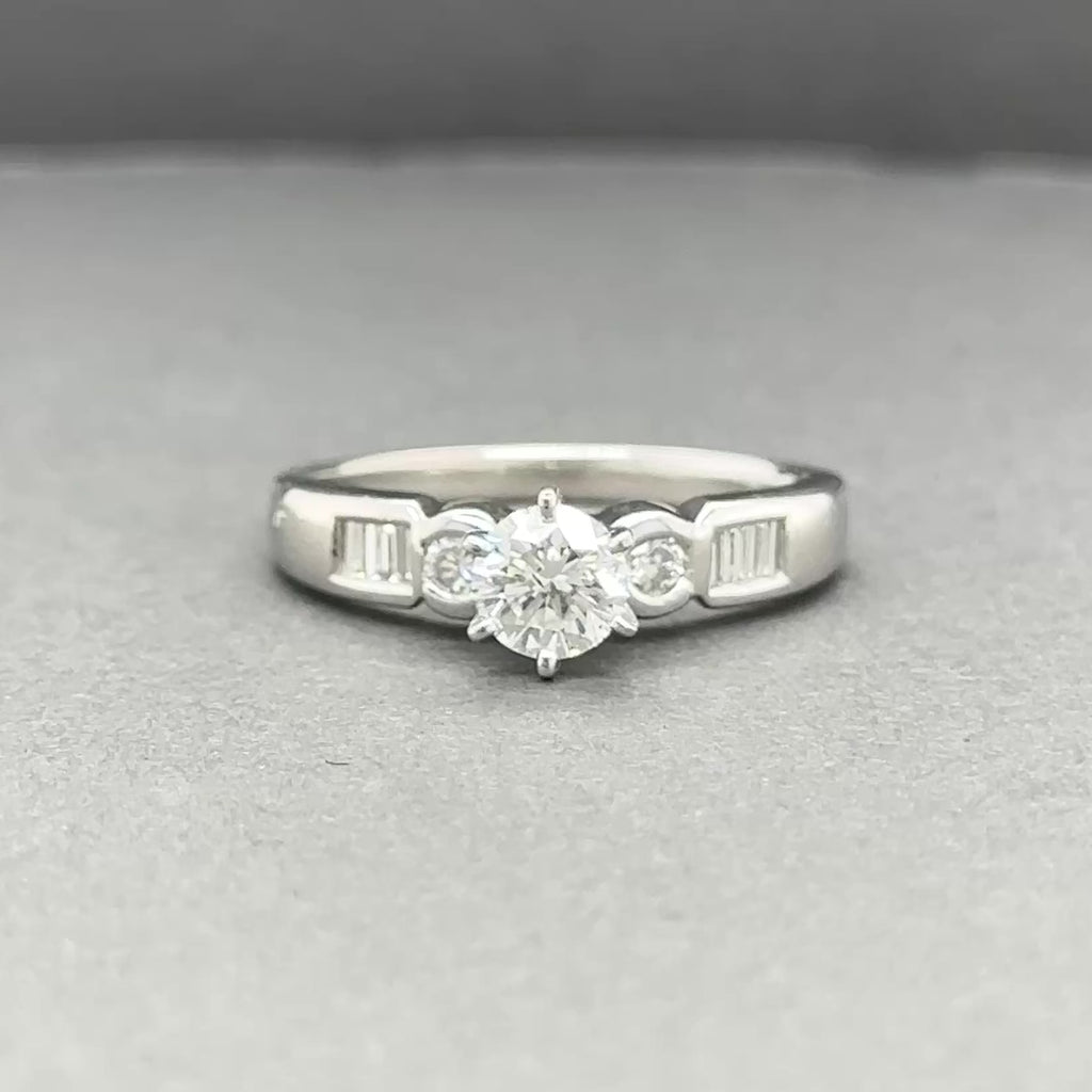 Piedras: Diamante central, redondo, peso total de 0,50 quilates, color I, claridad I3; Diamantes redondos y baguette en los laterales.