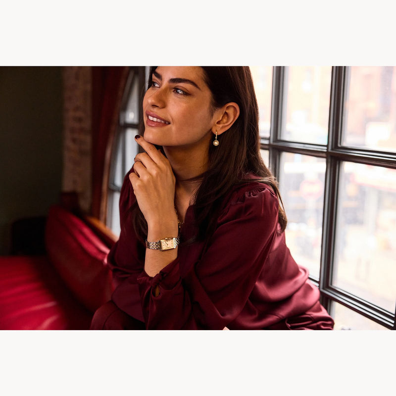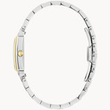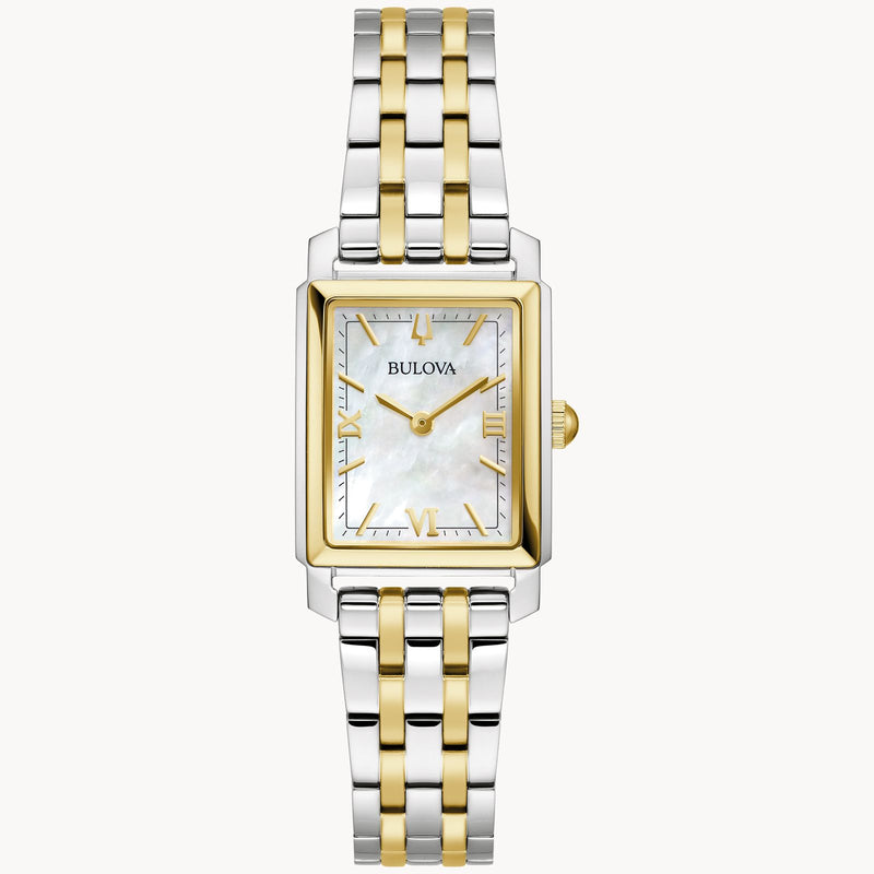 This all-new Bulova ladies’ timepiece adds new style to the already impressive Sutton Collection. The elegant two-tone stainless rectangular steel case with a silver-tone body and a gold-tone frame around the mineral crystal. The opalescent mother-of-pearl dial is accented with gold-tone hour markers and matching hands for a look of true sophistication. A matching five-link bracelet features a deployant closure with pushers for a perfect fit. This Bulova ladies’ timepiece is perfectly styled for the woman who is ready to make a statement.