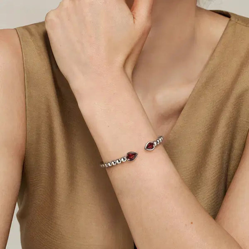Indulge in luxury with our Sterling Silver Garnet Beaded Bangle Bracelet. Crafted from stunning sterling silver, this open bangle showcases 2 pear shape garnet gems at the opening. The perfect touch of elegance for any occasion.