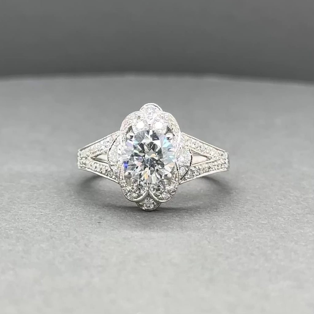 Add a touch of luxury to your look with this Estate 14K Gold Ring. Crafted from 14k white gold and adorned with 56 sparkling diamonds, this exquisite piece shines with sophistication. The 0.44ctw diamonds, G-H color, and SI1-2 clarity add an elegant touch, while the ability to fit a 6.5mm round stone makes it perfect for a 1ct round diamond. Elevate any outfit with this stunning ring.