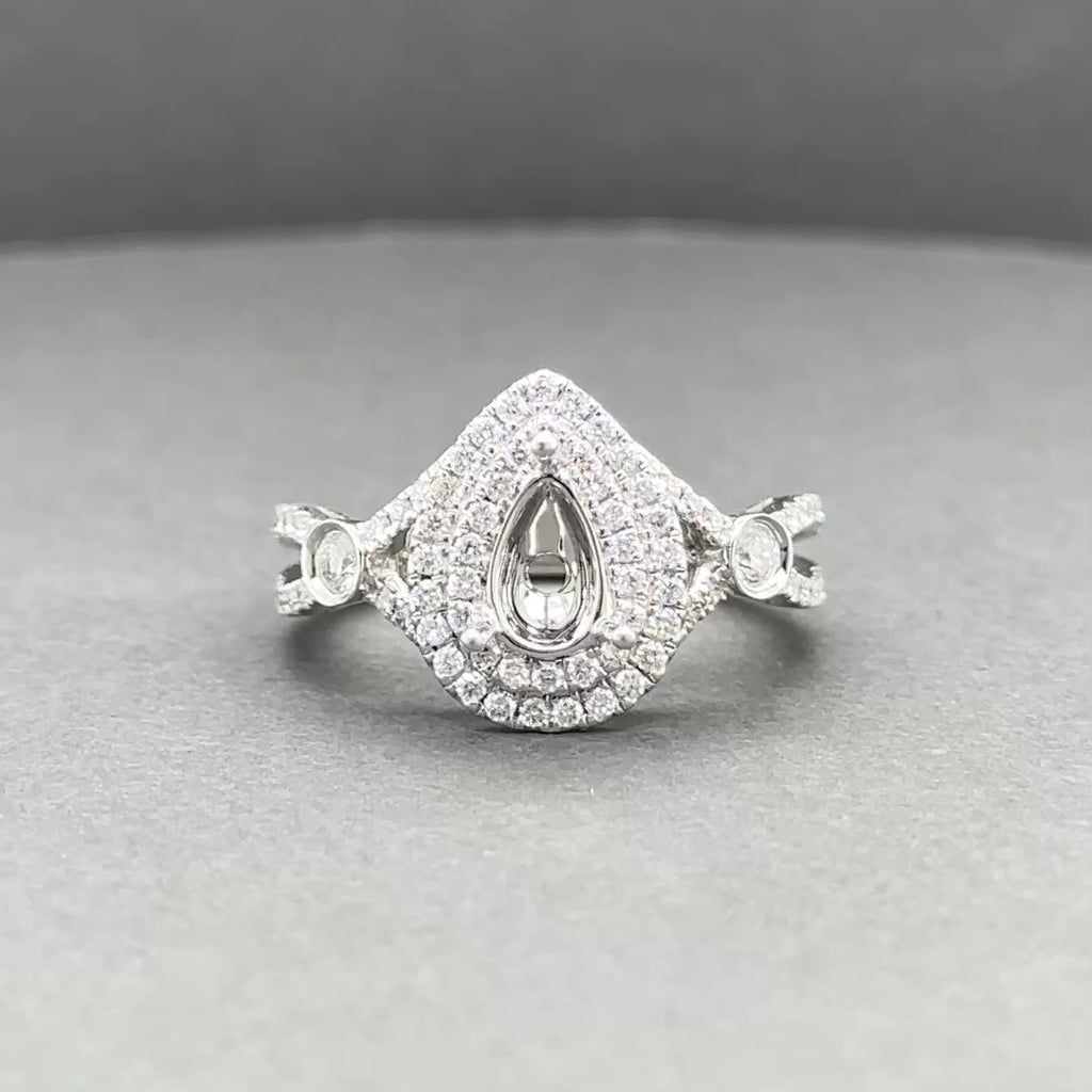 Indulge in the ultimate luxury with our Estate 14K Gold 0.60ctw Pear Shape Diamond Eng. Ring. Crafted in 14k white gold and adorned with 85 round diamonds, this ring exudes sophistication and elegance. The double halo top measures 13.33mm wide, while the band is a delicate 2.27mm. It can be sized to fit a 6x4mm pear cut stone or 0.50ct pear diamond. Elevate your style with this exquisite piece.