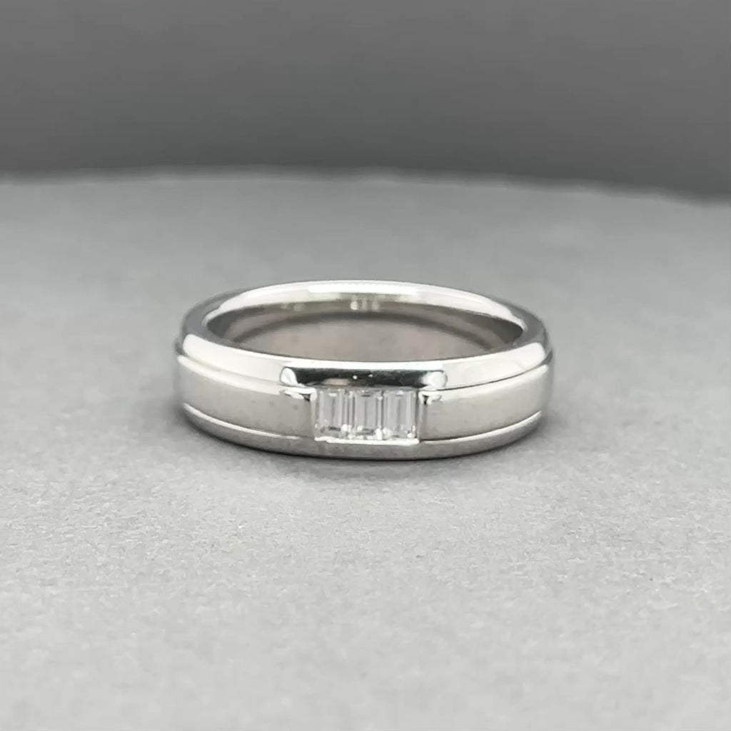 Elevate any outfit with our Estate 18K Gold 0.33ctw Diamond Men’s Ring. Crafted from 18k white gold, this ring features 3 baguette cut diamonds with H color and VS1-SI1 clarity, totaling 0.33ctw. Measuring 6.00mm wide and weighing 6.87dwt, this ring is both stylish and durable. Available in size 10, it can also be sized for the perfect fit. Add a touch of luxury to your wardrobe with this exclusive piece.