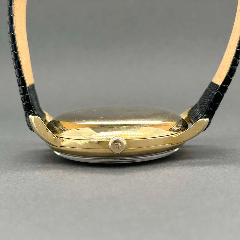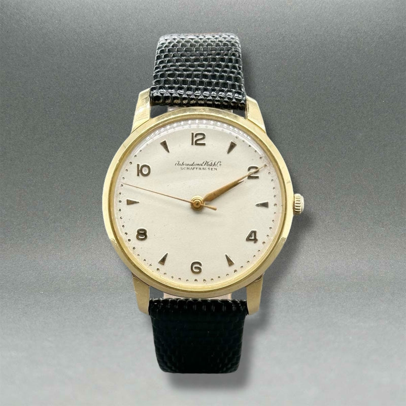 This exquisite vintage men’s watch from IWC features an 18k yellow gold 34mm case paired with a sleek black leather strap, designed to fit wrists up to 7.5 inches. Its white dial showcases elegant dagger and dauphine hands alongside Arabic numerals, all protected by a classic acrylic crystal. Powered by a reliable 21-jewel automatic movement, this timepiece from the 1950s combines timeless craftsmanship with refined sophistication, weighing 25.03 dwt for a substantial yet comfortable presence on the wrist.