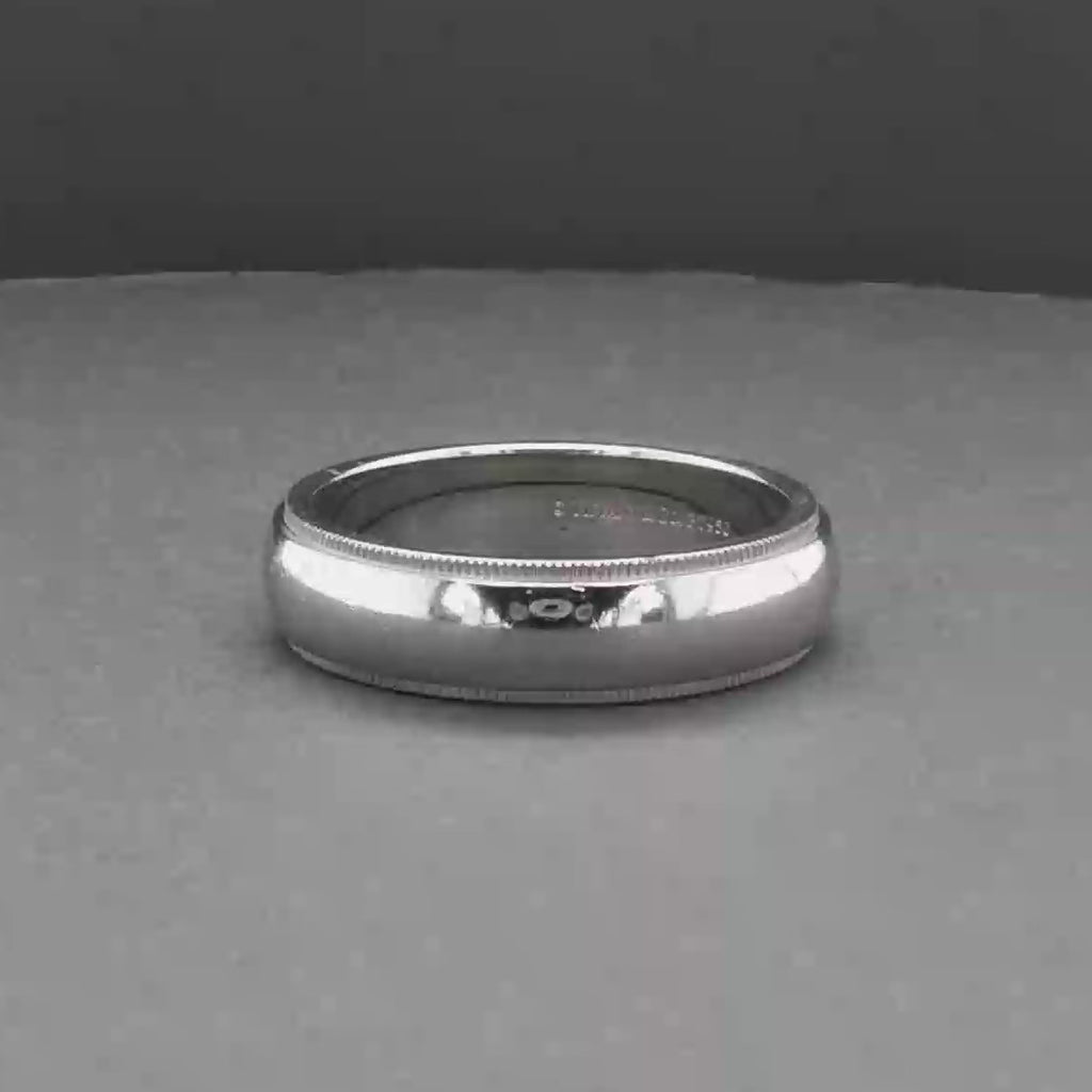 This elegant estate Tiffany & Co. platinum ring features a polished finish with delicate milgrain edges, measuring 6.04mm wide. Sized at 10.75 and weighing 10.20 dwt, this timeless design offers the option to be resized for a perfect fit. A retired piece originally valued at $3,100, it embodies exceptional craftsmanship and enduring sophistication.