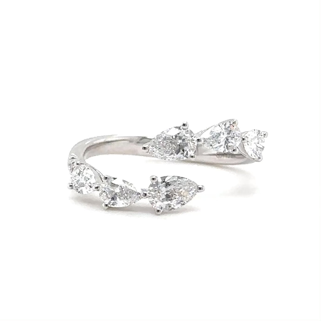 This elegant crossover ring showcases the timeless beauty of pear-shaped lab created diamonds set in lustrous 14K white gold. Featuring 1.17 carats of F-color, VS2-clarity diamonds, this piece combines exceptional sparkle with refined craftsmanship. The distinctive crossover design creates a modern silhouette that flatters the hand, while the premium diamond quality ensures lasting brilliance. Perfect for those who appreciate understated luxury and distinctive style.