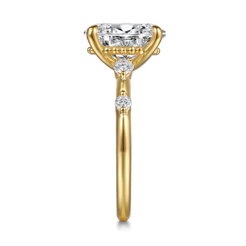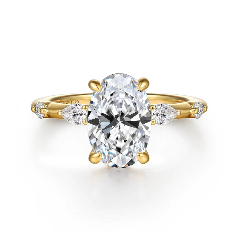 A true embodiment of timeless sophistication, this 14K yellow gold engagement ring invites you to embark on a journey where each diamond station twinkles at every turn. At its heart, a radiant 3ct oval-cut diamond commands attention, cradled in a lower minimal head and secured by a single-prong setting that enhances its brilliance. Along the shank, 0.25ct diamond stations of 2 pear shape and 2 round unfold, creating a mesmerizing path of light and grace.