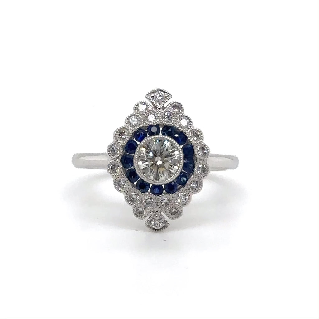 Elevate your style with this 18K white gold antique style ring, adorned with a stunning 0.26ctw sapphires and 0.67ctw H/SI2 diamonds. Experience the luxury of this exquisite piece, featuring a beautiful contrast of colors and a timeless design. Make a statement of elegance with this premium ring.