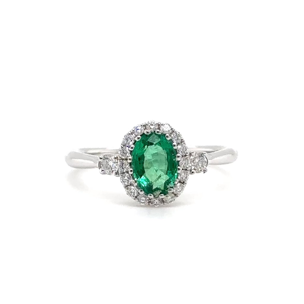 This exquisite 18K white gold ring features a stunning 0.75carat oval emerald centerpiece, elegantly surrounded by a halo of 0.25 carats of H color, SI1 clarity diamonds. The refined design highlights the vibrant sapphire while adding brilliance and sophistication,
