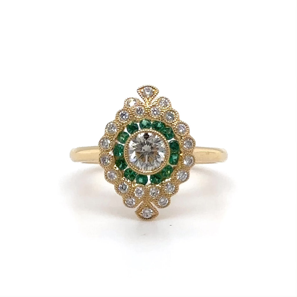 Elevate your style with this 18K yellow gold antique style ring, adorned with a stunning 0.17ctw emeralds and 0.64ctw H/SI2 diamonds. Experience the luxury of this exquisite piece, featuring a beautiful contrast of colors and a timeless design. Make a statement of elegance with this premium ring.