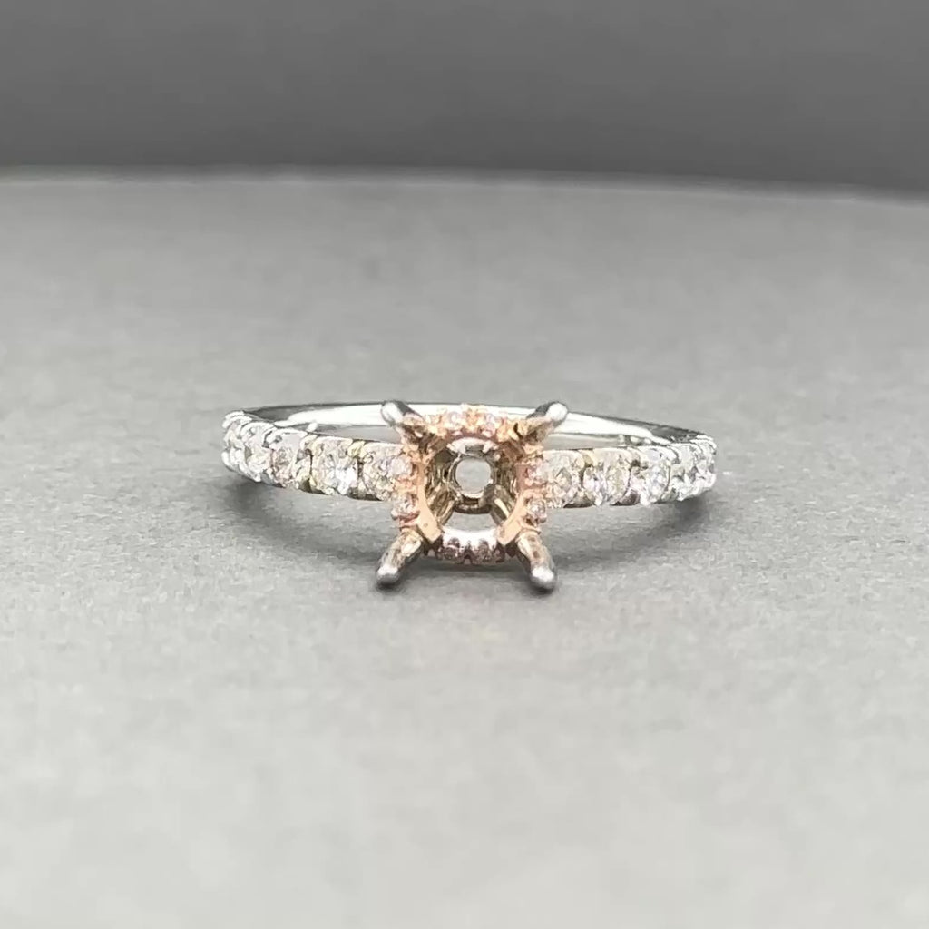 This estate engagement ring combines 14K white and rose gold, showcasing 20 prong-set round diamonds totaling 0.50 carats with H color and SI1-I1 clarity for a refined brilliance. The design measures 7.50mm wide at its elegant 4-prong top and narrows to a 2.07mm band, blending two-tone sophistication with delicate proportions. Sized at 6.75 and adjustable, it is crafted to hold a 7.30mm round center stone, ideal for a 1.50-carat round brilliant diamond, creating a distinctive and timeless setting.