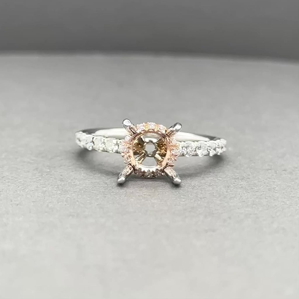 This estate engagement ring combines 14K white and rose gold, featuring 24 prong-set round diamonds totaling 0.38 carats, with H color and SI2 clarity for a subtle yet elegant sparkle. The ring measures 8.24mm wide at its refined 4-prong top and tapers to a slender 1.72mm band, offering a delicate and sophisticated design. Sized at 6 and adjustable, it is crafted to hold an 8.30mm round center stone, ideal for a 2.25-carat round brilliant diamond, creating a timeless setting for a stunning centerpiece.