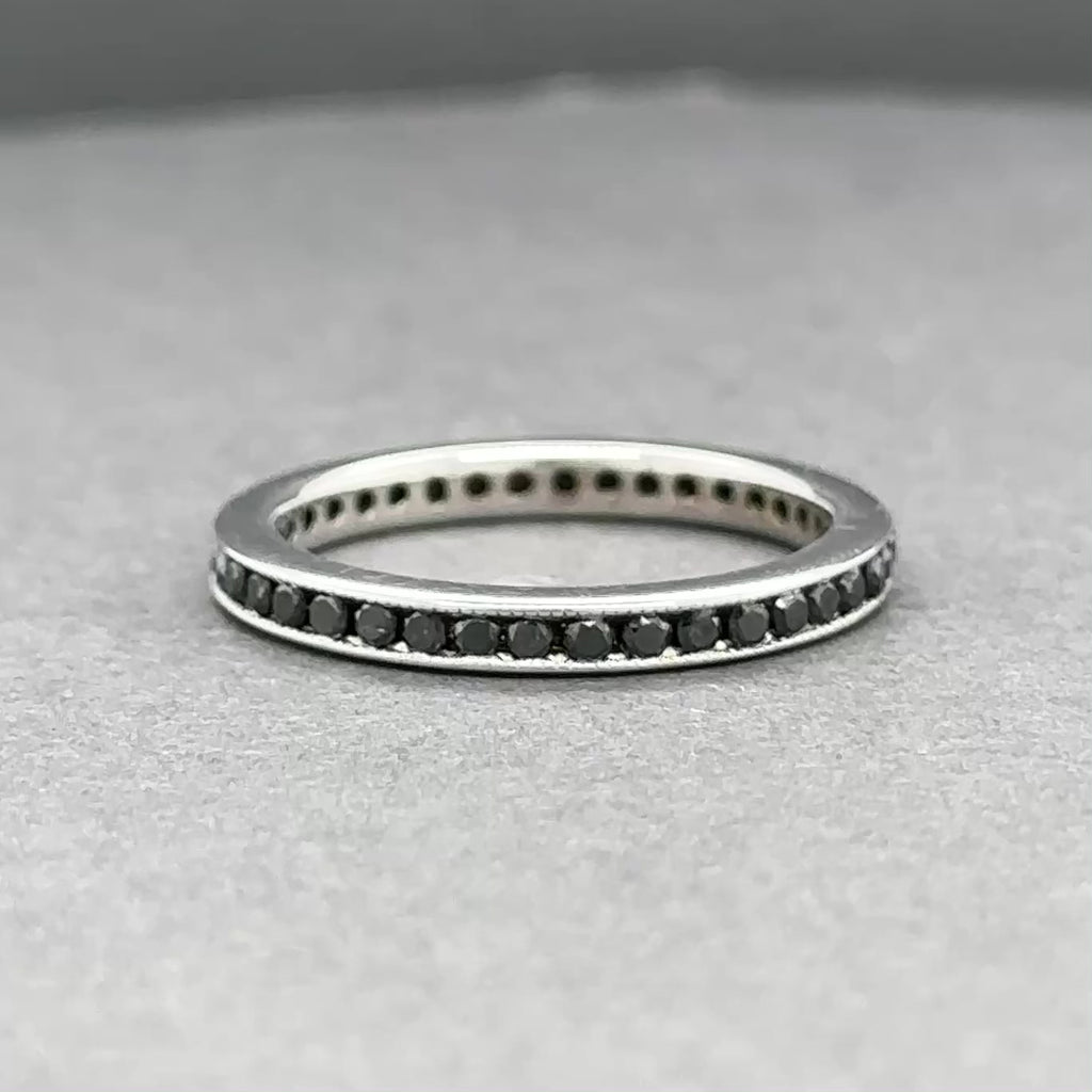 This elegant eternity ring showcases 39 fancy intense black diamonds totaling 0.41 carats, expertly channel set along a sleek 14K white gold band. The sophisticated design features round brilliant cuts that catch light beautifully, creating a striking contrast against the precious metal. Measuring just 2.20mm wide, the ring offers a refined profile perfect for stacking or wearing alone. Crafted to exacting standards, this estate piece weighs 1.13 dwt and arrives in size 5.5. Please note this ring cannot be resized, making it ideal for collectors seeking a distinctive statement piece with timeless appeal.