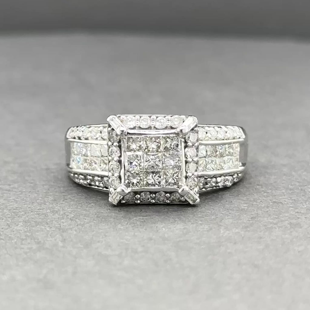 This exquisite estate ring showcases 65 diamonds in princess, round, and baguette cuts, totaling 0.98 carats of H-I color and SI1-I1 clarity stones. Crafted in 14K white gold, the diamonds are expertly set using invisible, prong, and bar settings for maximum brilliance and security. The ring measures 9.10mm at its widest point with a refined 2.20mm band, creating an elegant silhouette. Currently sized at 6 and weighing 2.44 dwt, this timeless piece can be resized to fit your needs. A sophisticated choice for those who appreciate fine jewelry with distinctive character and enduring craftsmanship.