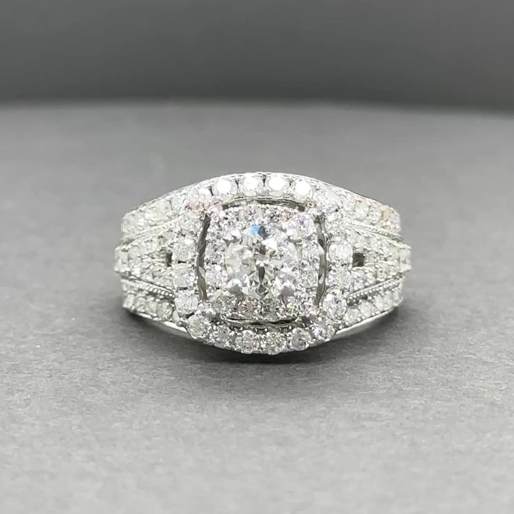 This elegant estate cocktail ring showcases 95 sparkling round-cut diamonds totaling 2.06 carats, set in lustrous 14K white gold. The diamonds, graded H-I color and SI2-I1 clarity, are expertly prong-set for maximum brilliance and security. The ring features a graceful design with a 12.60mm wide top that tapers to a refined 1.90mm band, creating a striking silhouette. Currently sized at 7 and weighing 4.57 dwt, this timeless piece can be professionally resized to fit your needs. A sophisticated statement ring perfect for special occasions or everyday luxury.