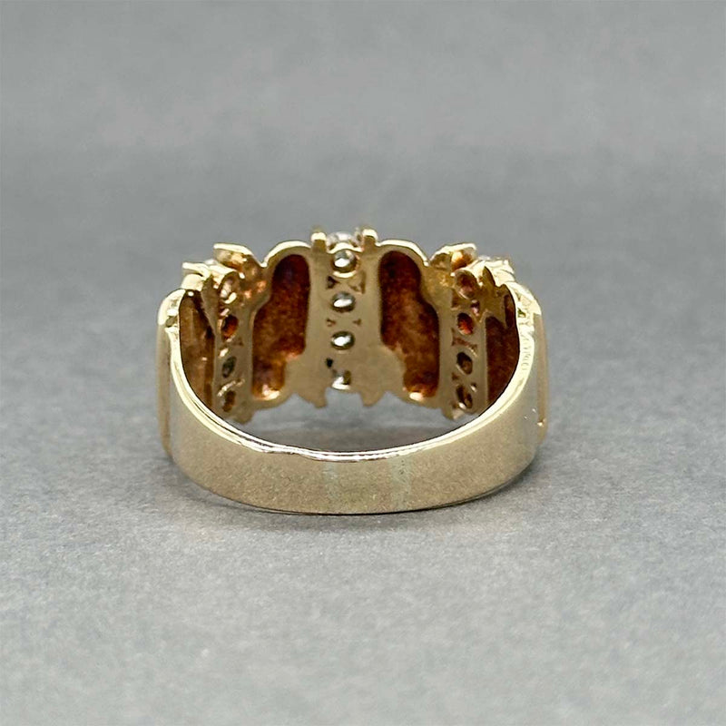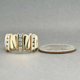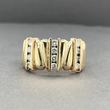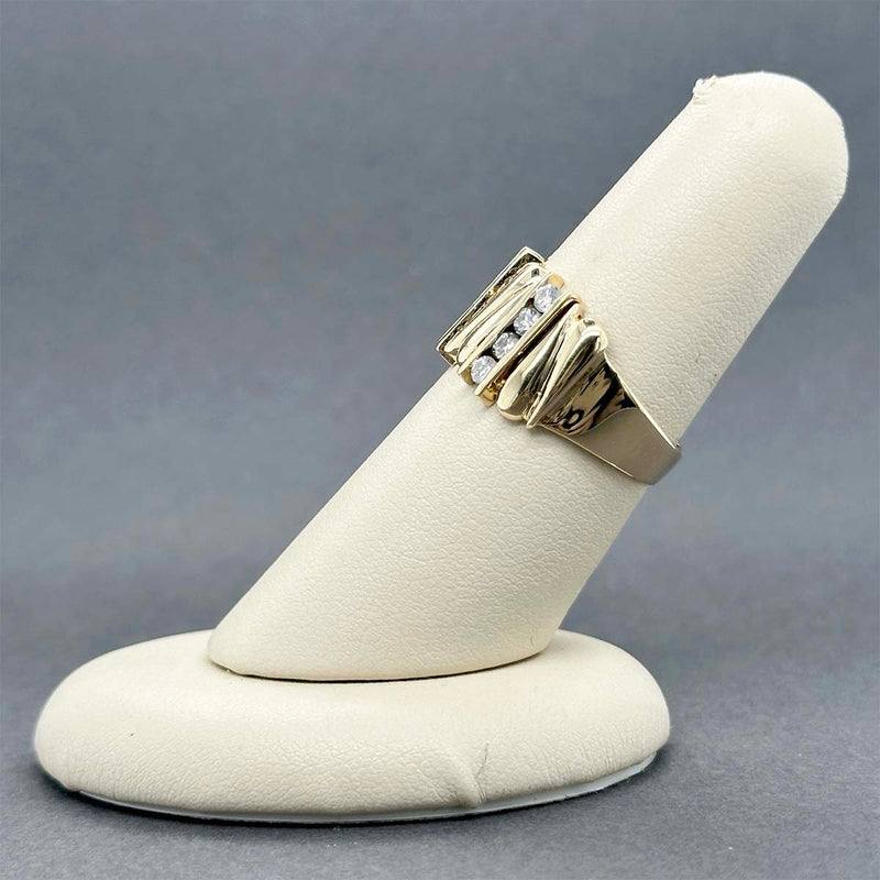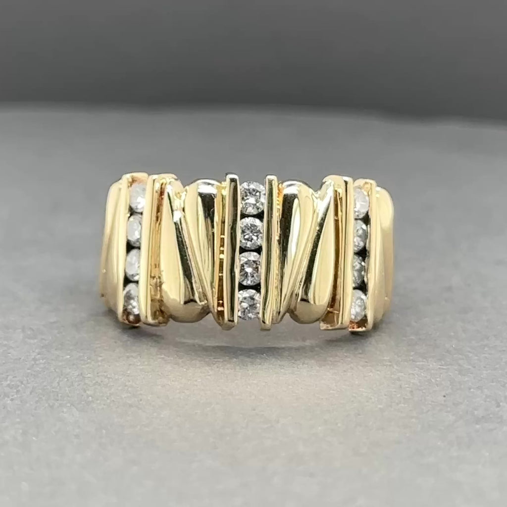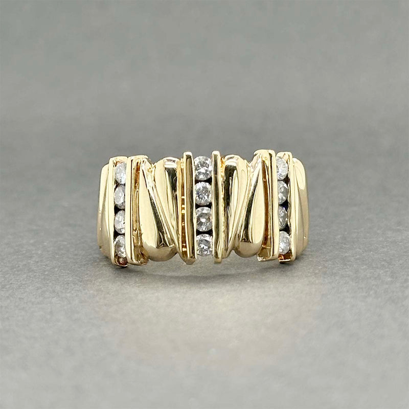 This vintage estate ring from the 1980s–1990s features 14k yellow gold crafted into a sculptural design. It showcases 12 round, channel-set diamonds totaling 0.20 carats, with K-L color and I1 clarity, offering subtle sparkle. Measuring 11.30mm at the top and 3.50mm at the band, this size 8 ring can be resized for a perfect fit. Weighing 4.10 dwt, it combines timeless elegance with refined craftsmanship.