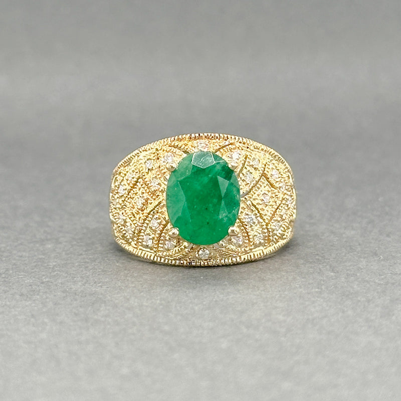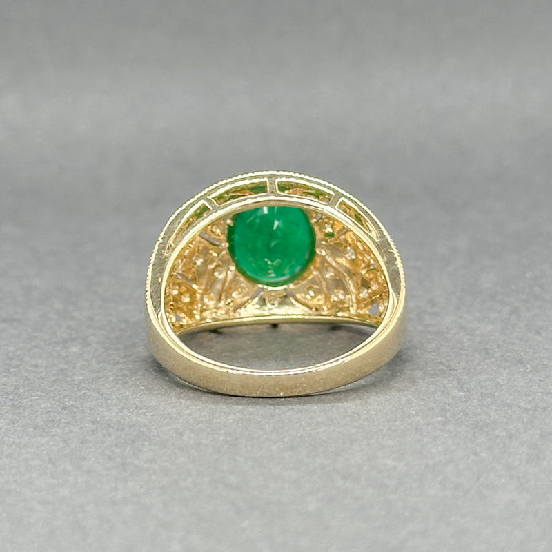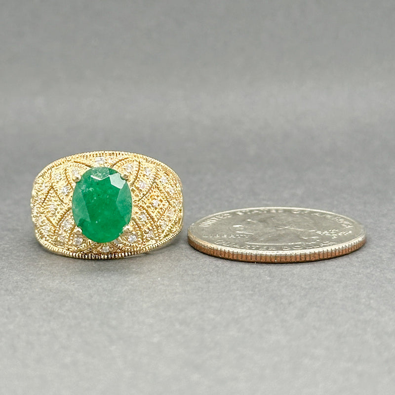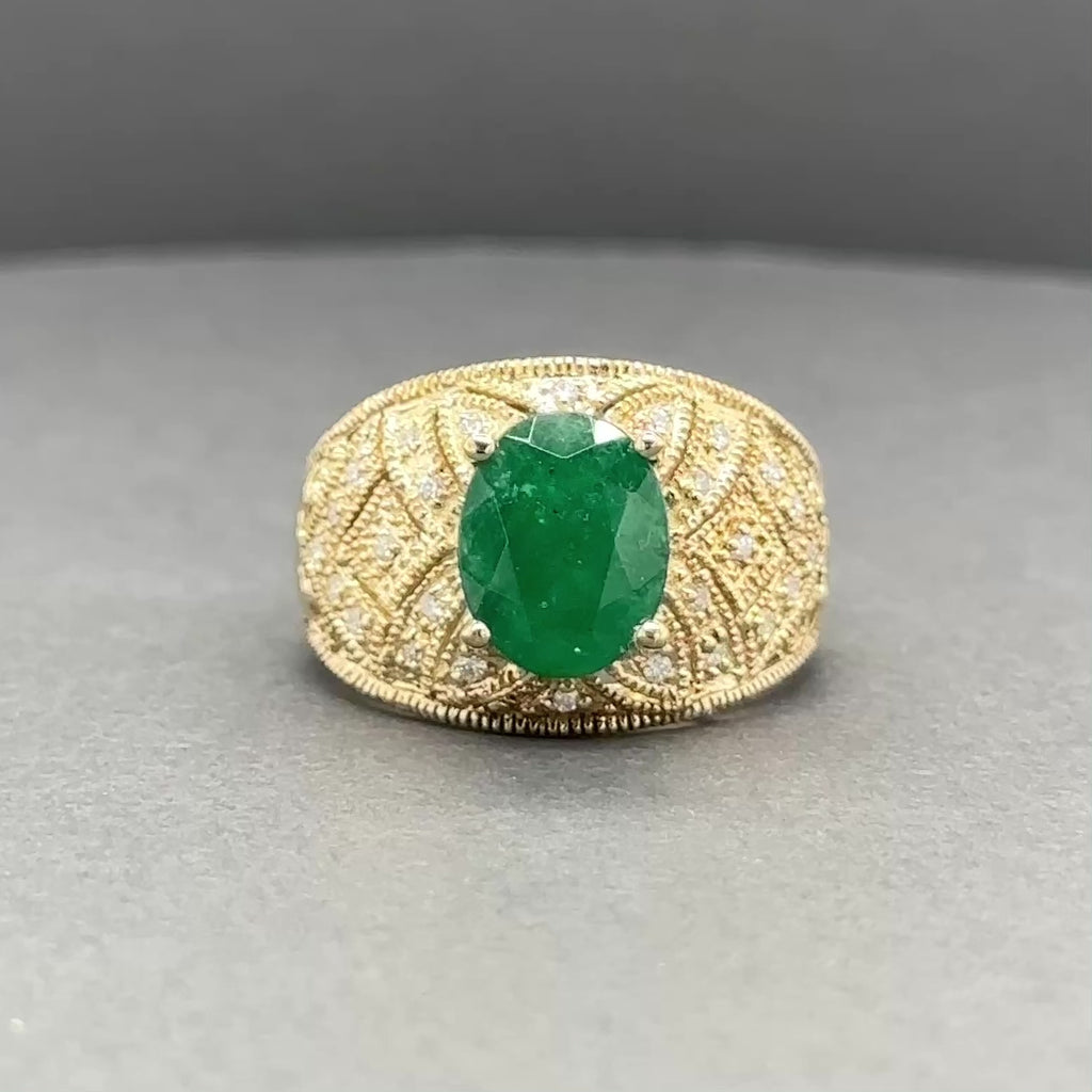 Indulge in true luxury with this Estate 14K Gold 2.06ct Emerald & 0.11ctw Diamond Ring. The vibrant oval cut emerald, enhanced for clarity, is set on a 14k yellow gold band. Adorned with 26 round diamonds, this exclusive ring is a stunning statement piece. Available in size 7, can be resized. Weighs 2.85dwt.