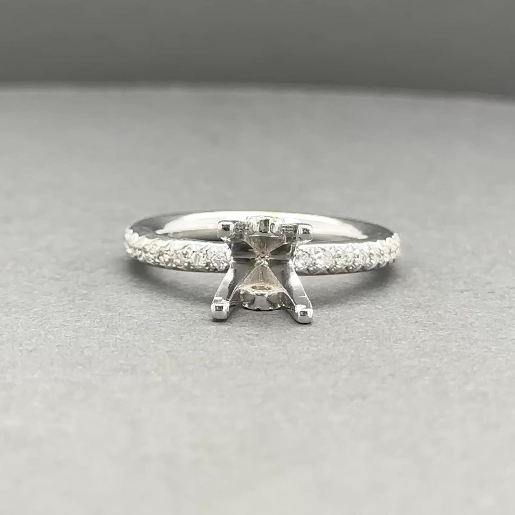This estate engagement ring in 18K white gold features 28 prong-set round diamonds totaling 0.35 carats, combining H color and fancy light yellow hues with SI1 clarity for a unique, elegant sparkle. The ring measures 7.19mm wide at its refined 4-prong top and tapers to a 2.46mm band, offering a balanced and sophisticated design. Sized at 6.5 and adjustable, it is crafted to hold a 6.80mm round center stone, perfect for a 1.25-carat round brilliant diamond, creating a stunning custom setting.