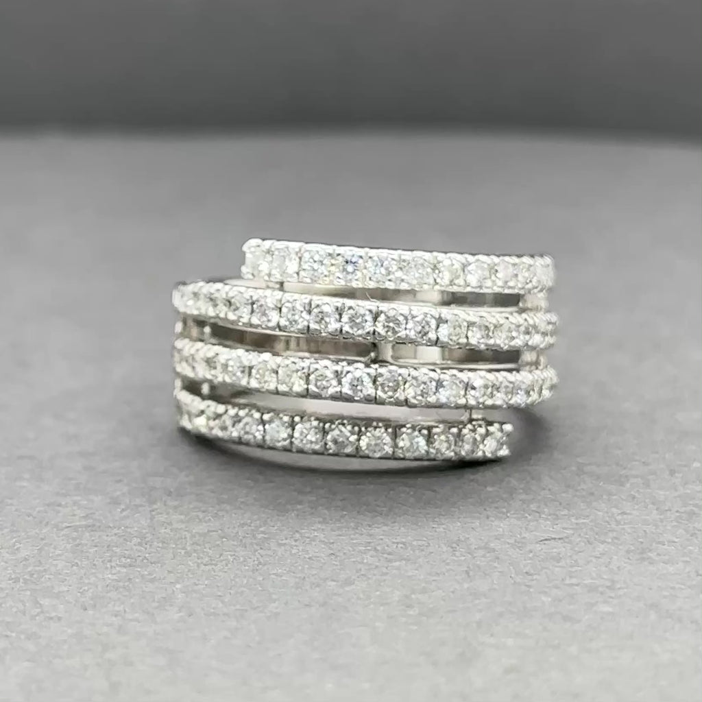 This elegant wrap ring showcases 64 round brilliant diamonds totaling 0.99 carats, graded H-I color and SI1-2 clarity, expertly set in fishtail prong settings. Crafted in 18K white gold, the design features a graceful silhouette that measures 11.35mm at the crown and tapers to a refined 5.70mm band width. Weighing 6.10 dwt, this sophisticated piece can be professionally sized to fit your needs, making it a versatile addition to any fine jewelry collection.