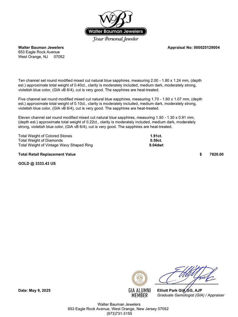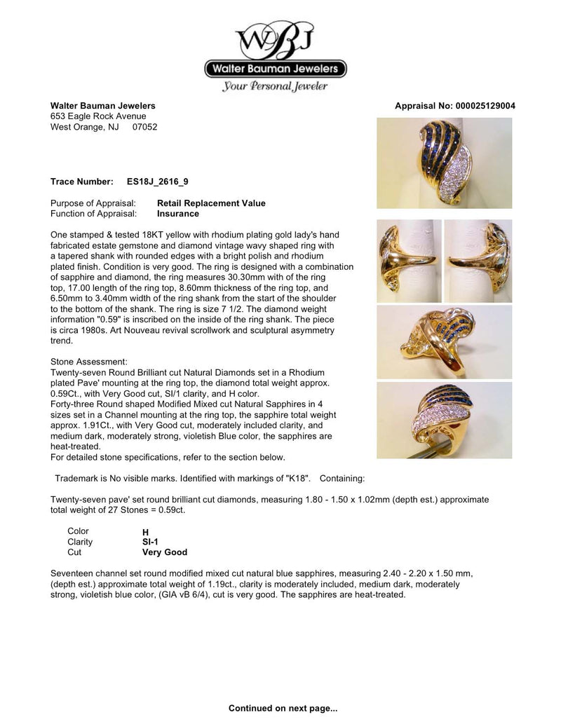 This estate piece comes with two customized copies of the Walter Bauman Jewelers appraisal, available upon request.