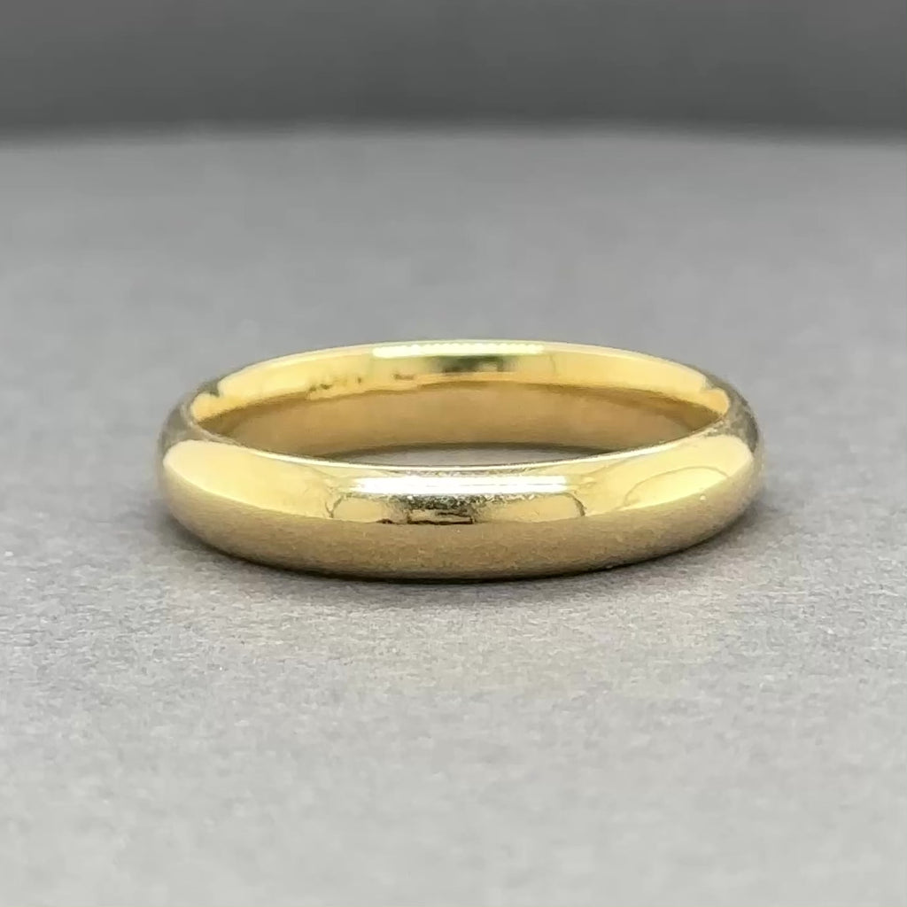 This elegant estate ring showcases the timeless appeal of 18k yellow gold, crafted with a refined 4.12mm polished band that catches light beautifully. Currently sized at 9 and weighing 3.80 dwt, this piece offers both substance and sophistication. The ring can be professionally resized to fit your finger perfectly, making it an adaptable treasure for everyday wear or special occasions. A distinguished addition to any jewelry collection.