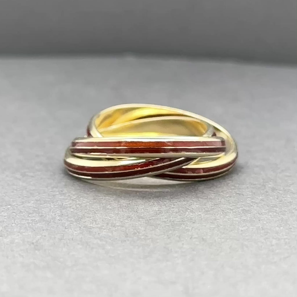 This elegant estate ring features lustrous 18k yellow gold crafted with striking red enamel detailing. The distinctive rolling design showcases dimensional width, measuring 8.7mm at its widest point and tapering to 3.0mm at its narrowest, creating visual interest from every angle. Sized at 5.5 and weighing 4.20 dwt, this piece carries the character and quality of fine vintage jewelry. Please note this ring cannot be resized, making it ideal for collectors seeking an authentic estate treasure with timeless appeal.