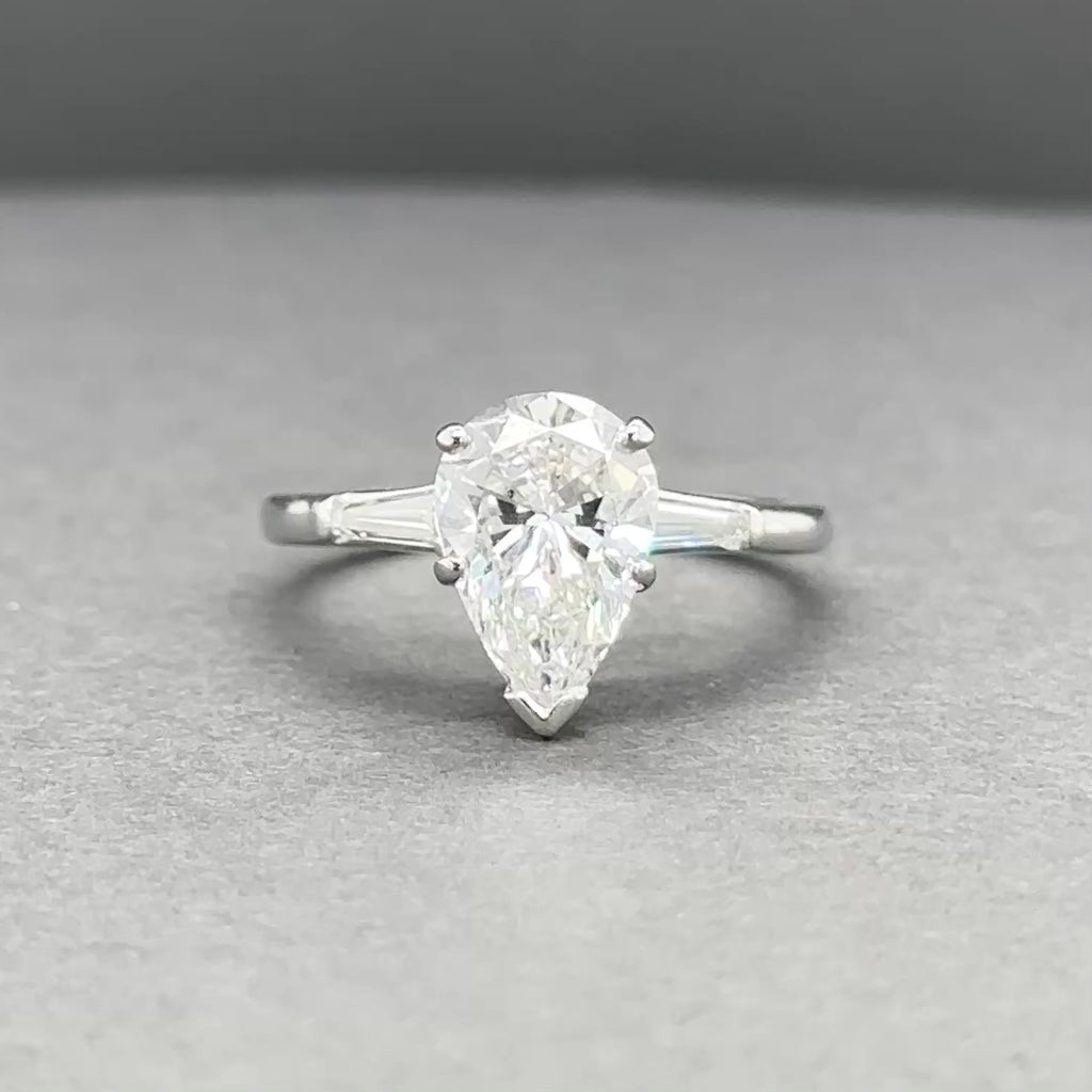 This elegant estate engagement ring showcases timeless design crafted in 850 platinum. The centerpiece features a stunning pear-cut cubic zirconia in eye-clean white, flanked by two tapered baguette-cut stones for added brilliance and dimension. Each stone is prong-set for secure, classic appeal. Measuring 10.87mm across the top with a delicate 1.36mm band, this ring balances presence with refined proportion. Currently sized at 5.75 and can be adjusted to fit your needs. A sophisticated choice for those seeking luxury with versatility.