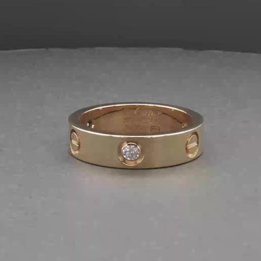 This Estate Cartier Love Classic ring, crafted in luxurious 18K yellow gold, features three bezel-set round diamonds (0.22ctw) that add timeless elegance. Measuring 5.47mm wide and weighing 6.40 dwt, it offers a perfect balance of presence and refinement. Sized at 9 (approximately 59), the band’s intricate design prevents resizing without altering its pattern. A distinguished piece with a retail value of $4,200, it exemplifies Cartier’s iconic craftsmanship and enduring style.