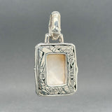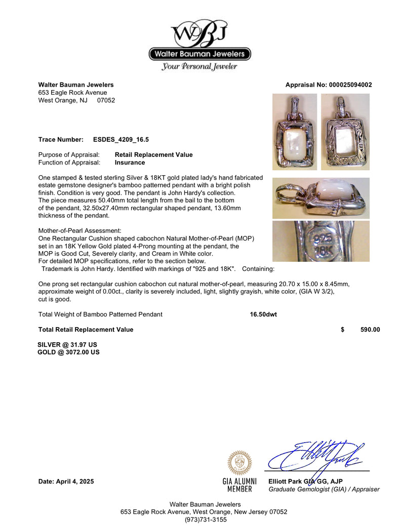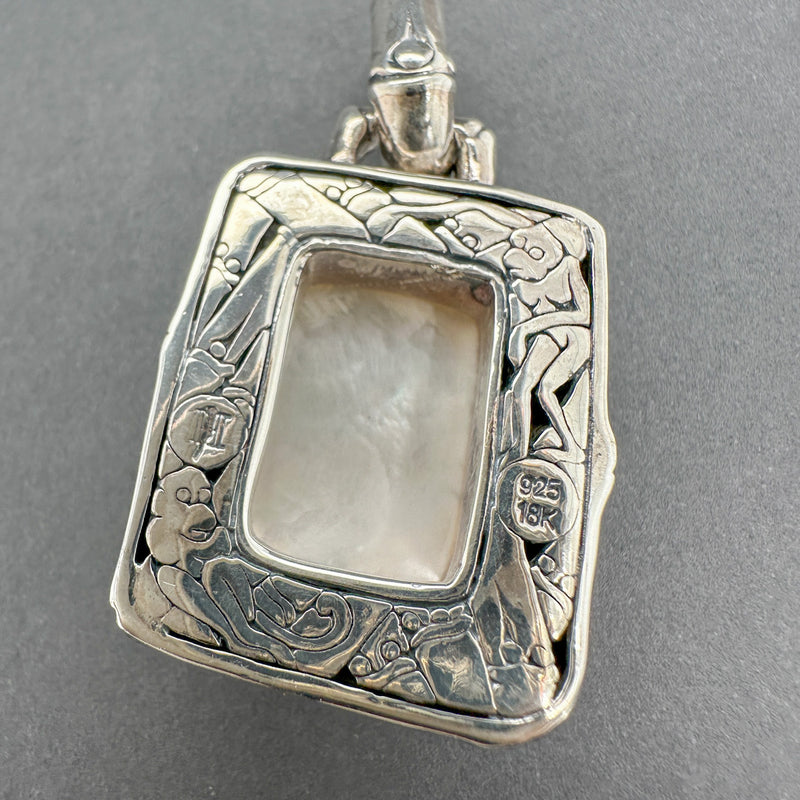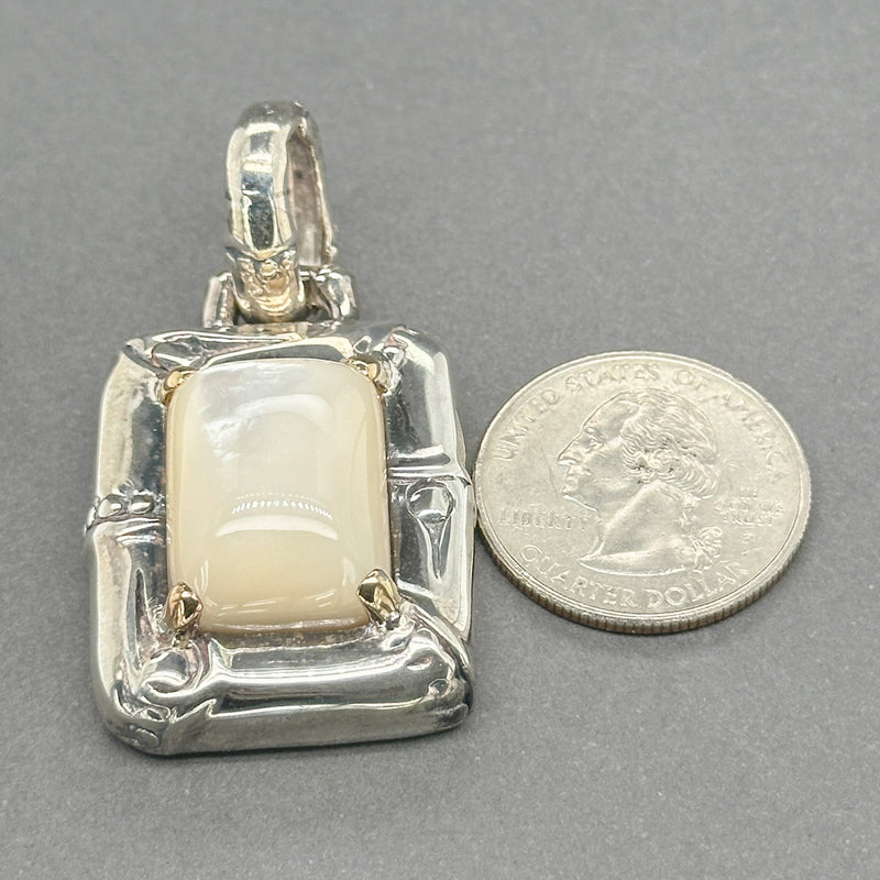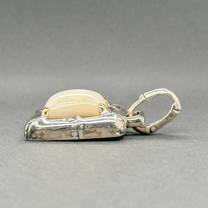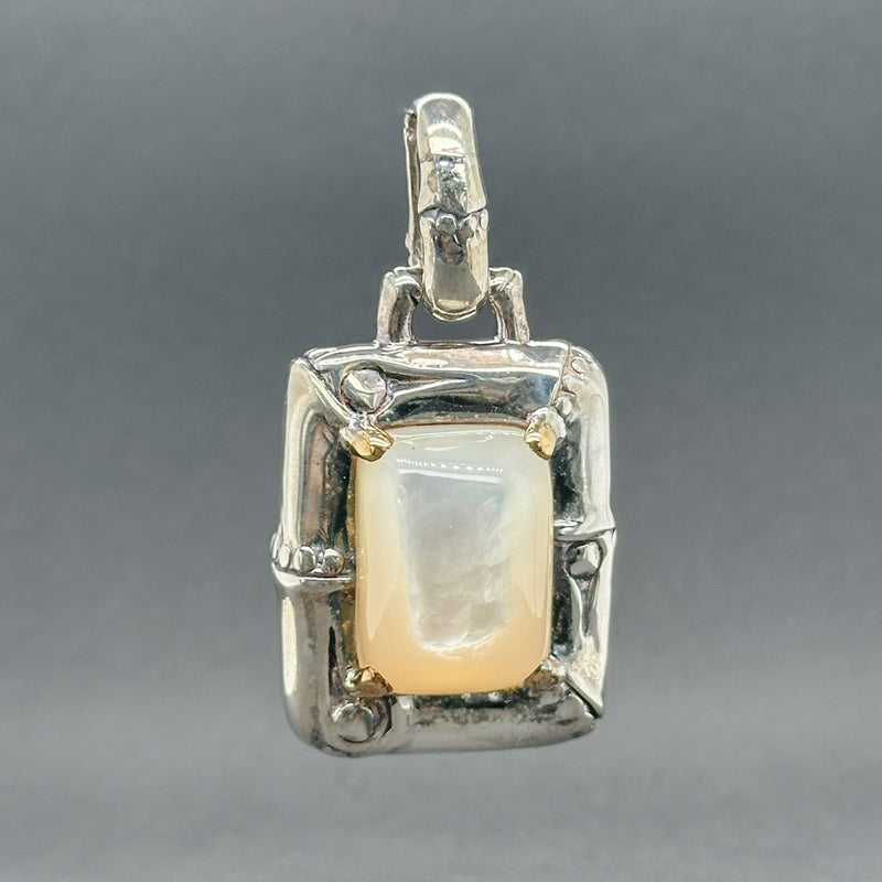 Indulge in exquisite elegance with our Estate John Hardy Mother Of Pearl Bamboo Pendant. Crafted from sterling silver and 18k yellow gold, this retired design features a stunning cabochon of mother of pearl. The generous size of 50.60mm x 27.30mm and 7mm inner diameter bail adds to its luxurious feel. Signed and weighing 16.50dwt, this pendant is a true statement piece that is sure to elevate any outfit.