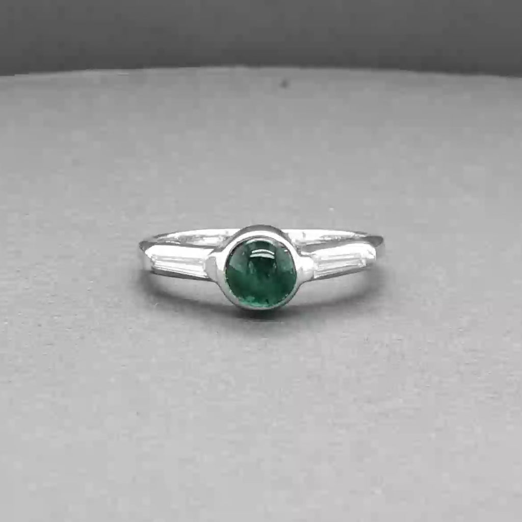 This elegant platinum ring showcases a 0.52ct round cabochon emerald in a bezel setting, its rich green hue enhanced for clarity. Flanked by two G color, VS2-SI1 clarity baguette diamonds totaling 0.16ctw in bar settings, it offers refined brilliance. Measuring 6.70mm at the top with a 1.40mm band, this size 5 piece can be resized to fit perfectly, weighing 2.00dwt. Ideal for those who appreciate timeless sophistication and understated luxury.
