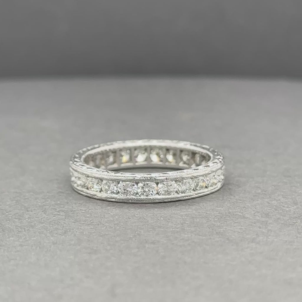 This exquisite platinum eternity ring showcases 25 round diamonds in F-G color with SI1-2 clarity, totaling 1.25 carats of brilliant sparkle. Channel-set stones wrap continuously around the band, symbolizing eternal love and commitment. Delicate wheat design engraving adorns the edges, adding timeless elegance to this sophisticated piece. Measuring 3.50mm wide and crafted from premium platinum, this estate ring weighs 2.80 dwt. Presented in size 6 and cannot be resized. A refined choice for those who appreciate classic luxury and enduring beauty.