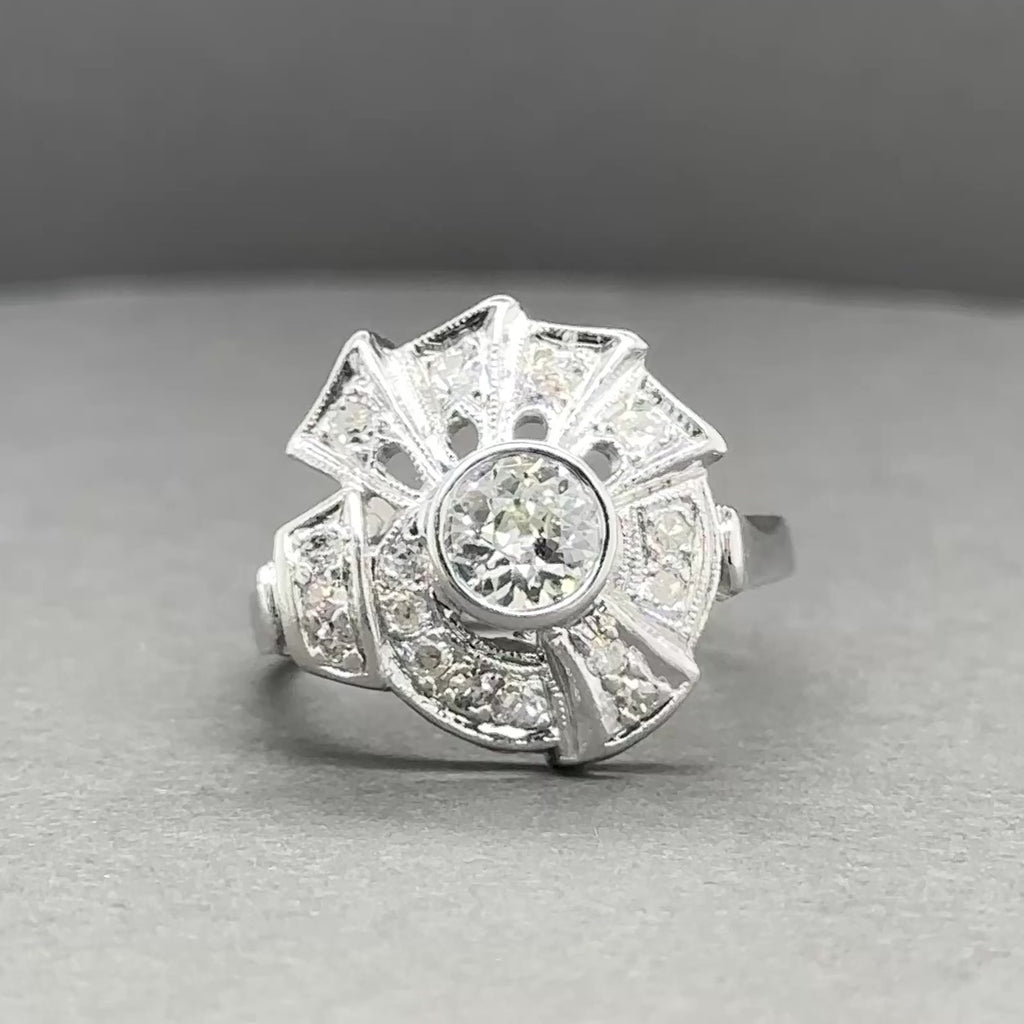 This exquisite estate platinum cocktail ring features 17 old European and single cut diamonds totaling 1.01 carats, set in a refined combination of bezel and bead prongs. With H-I color and SI1-I1 clarity, the stones offer subtle brilliance. Measuring 17.10mm across the top and 1.80mm wide at the band, this vintage piece from the 1930s–1940s embodies timeless elegance. Sized at 8.25 and adjustable for a perfect fit, it weighs 5.11 dwt, making it a sophisticated statement for any occasion.