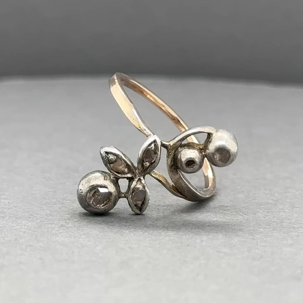 This exquisite Art Nouveau ring, crafted from sterling silver and 14k yellow gold, features six bezel-set rose cut diamonds totaling 0.17 carats. With J color and SI1 clarity, these diamonds add subtle brilliance to the 19.80mm wide top design. The delicate 1.00mm band, sized at 6.75 and adjustable, complements the ring’s antique charm from the early 1900s. Weighing 1.89 dwt, this piece embodies timeless elegance and refined craftsmanship.